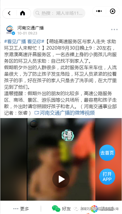 10月01日,大象網(wǎng)、微博視頻·河南交通廣播以題為《看見廣播 看見你——萌娃高速服務(wù)區(qū)與家人走失 求助環(huán)衛(wèi)工人來(lái)幫忙!》對(duì)所屬許昌服務(wù)區(qū)好人好事進(jìn)行了報(bào)道。