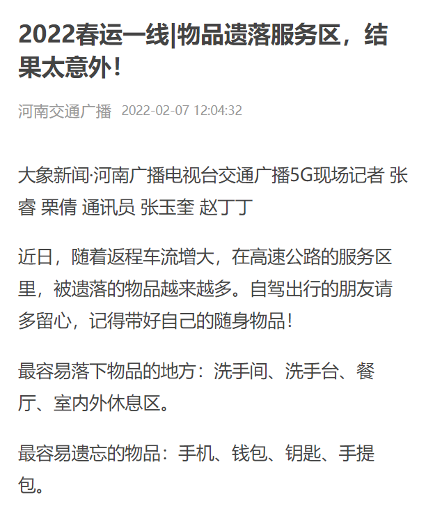 2022年2月7日,大象新聞、今日頭條、河南交通廣播以題為《2022春運一線|物品遺落服務區(qū),結果太意外!》對服務區(qū)公司服務保障、溫馨服務工作進行報道。