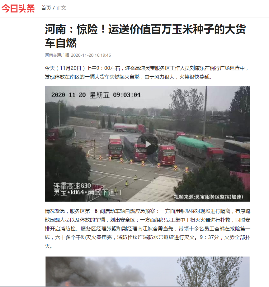 人民日?qǐng)?bào)、河南交通廣播、熱門(mén)微博、大象新聞、今日頭條、抖音:《驚險(xiǎn)!運(yùn)送價(jià)值百萬(wàn)玉米種子的大貨車(chē)自燃》