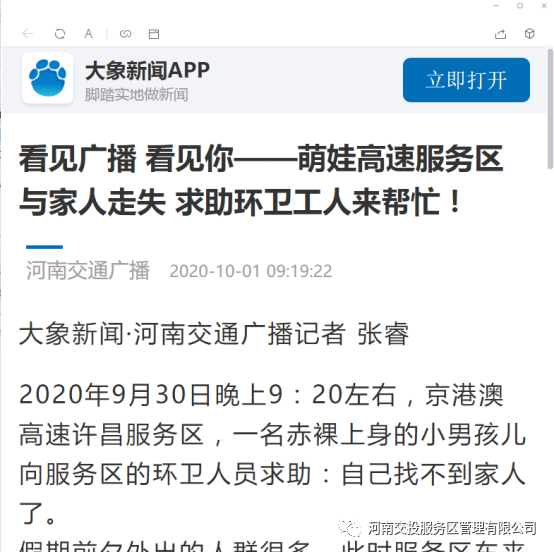 大象網(wǎng)、微博視頻·河南交通廣播:看見廣播 看見你——萌娃高速服務區(qū)與家人走失 求助環(huán)衛(wèi)工人來幫忙!