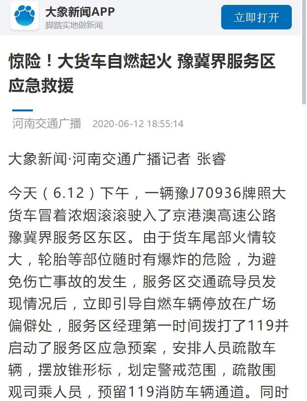 河南交通廣播以題為《驚險!大貨車自燃起火 豫冀界服務區(qū)應急救援》在大象新聞、今日頭條對豫冀界服務區(qū)應急救援進行了報道