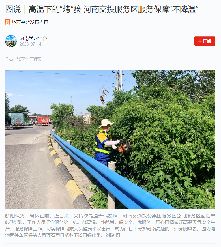 來(lái)源: 本站 發(fā)布時(shí)間: 2023-07-147月14日,“學(xué)習(xí)強(qiáng)國(guó)河南學(xué)習(xí)平臺(tái)” 以“高溫下的’烤’驗(yàn) 河南交投服務(wù)區(qū)服務(wù)保障‘不降溫‘”為題,對(duì)公司所屬服務(wù)區(qū)、加油站做好高溫天氣安全生產(chǎn)、服務(wù)保障工作進(jìn)行了宣傳報(bào)道。