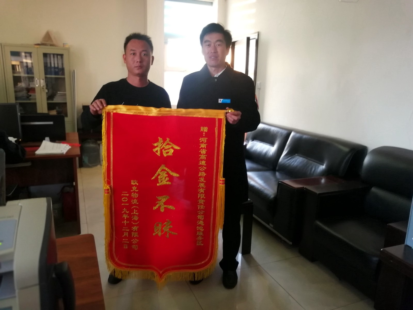 2019-12-04 作者:12月3日,澠池服務區(qū)辦公室迎來了兩位特殊客人,歐克物流(上海)有限公司兩名工作人員將一面寫著“拾金不昧”鮮紅的錦旗遞給服務區(qū)工作人員。 事情原由要從2019年11月26日說起:當日,澠池服務區(qū)北區(qū)廣場當班保潔員韓秦嶺在廣場撿到一申通快遞快遞包,包內有大小快遞16件?!?